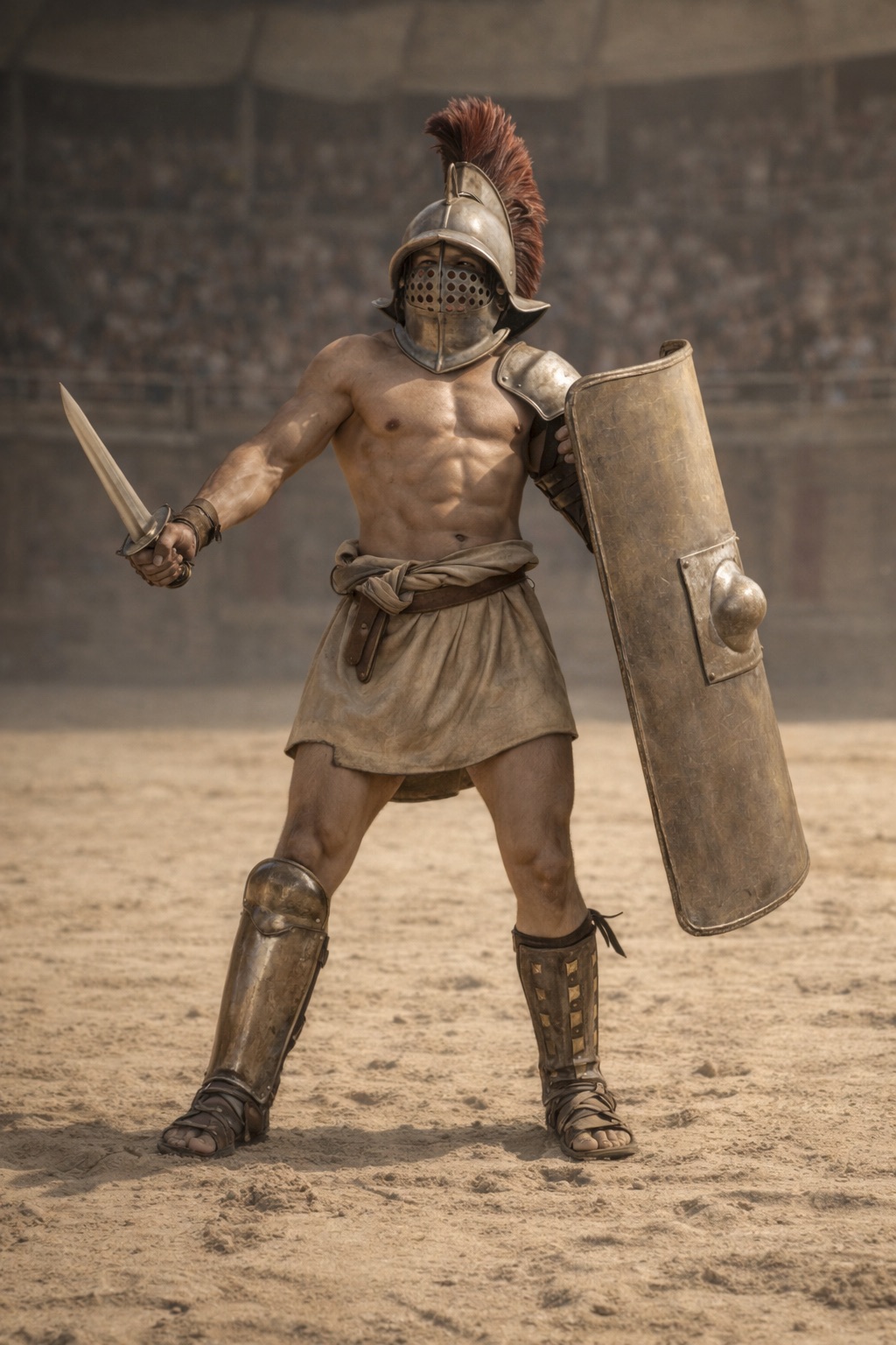 Compacto, ágil y ofensivo. Su espada curva (sica) está hecha para atacar por encima o alrededor de defensas, buscando piernas, costados y aperturas. Con escudo pequeño y grebas altas, el Thraex es un gladiador de presión inteligente: entra, corta, sale, vuelve a entrar. Es ideal para combates donde el público ve claramente la diferencia entre movilidad y protección.