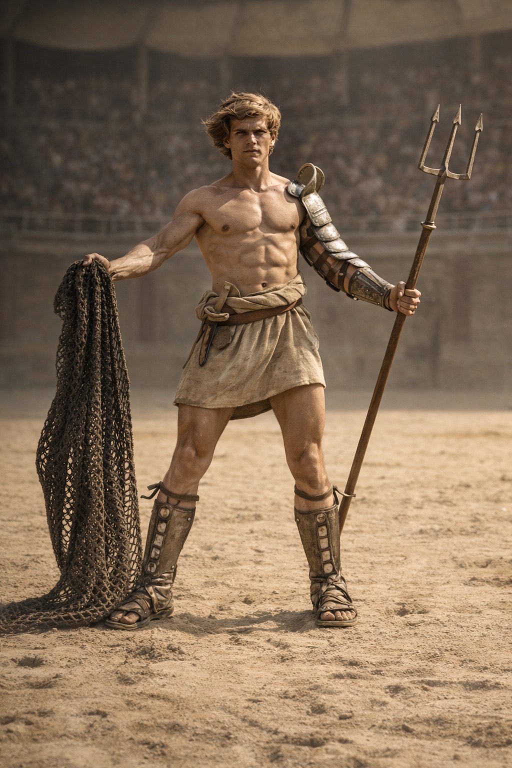 Ligero, veloz y sin casco: el Retiarius juega a la distancia. Su objetivo es controlar el ritmo con el tridente y la red, obligando al rival a reaccionar, perder equilibrio o exponer una apertura. No busca el choque frontal; busca fatigar, frustrar y castigar desde fuera del alcance de la espada. Cuando acierta con la red o fuerza un tropiezo, remata con el tridente o la daga.