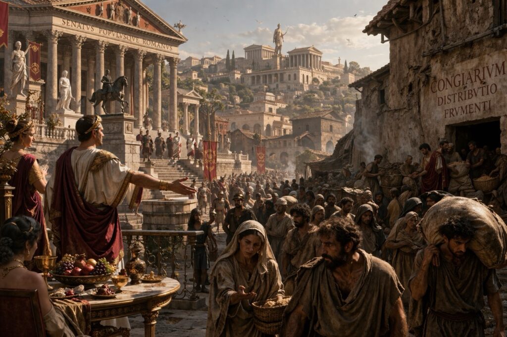 Cayo Graco amplía el horizonte reformista: grano, colonización, justicia provincial y ciudadanía. Ya no se trata solo de tierra, sino de reordenar cómo funciona Roma en Italia y en el imperio. Su caída y muerte consolidan la polarización y refuerzan la lógica del estado de excepción.