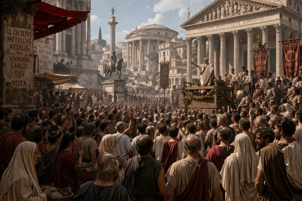 La plaza pública importa mucho más de lo que sugiere una lectura simplista de “oligarquía cerrada”. Contiones, juicios, elecciones, funerales aristocráticos, distribución de grano y rituales son espacios donde se fabrica legitimidad. La política romana tardorrepublicana no es silenciosa ni puramente palaciega: es teatral, corporal, competitiva y ferozmente pública. Por eso la propaganda monetal y la oratoria se vuelven tan importantes: convierten el conflicto político en un lenguaje visible y portable.