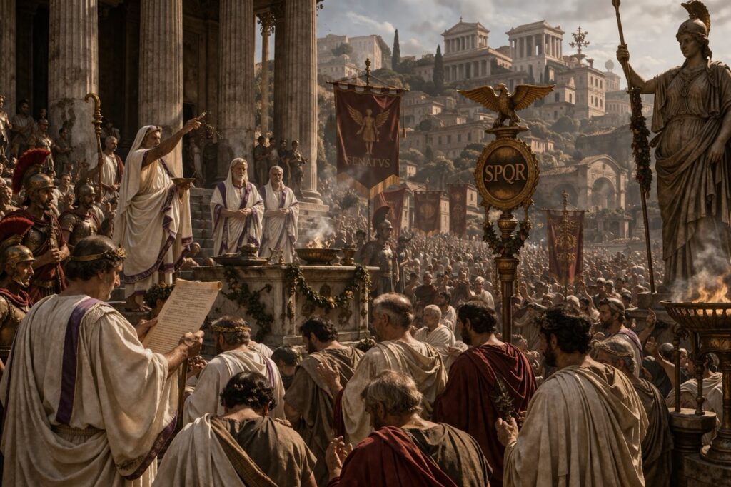 Octaviano escenifica una devolución de poderes y nace Augusto. Formalmente, la República sigue viva; en la práctica, ha surgido el Principado, una monarquía funcional que preserva formas republicanas mientras concentra provincias, ejércitos y capacidad real de decisión en el princeps.