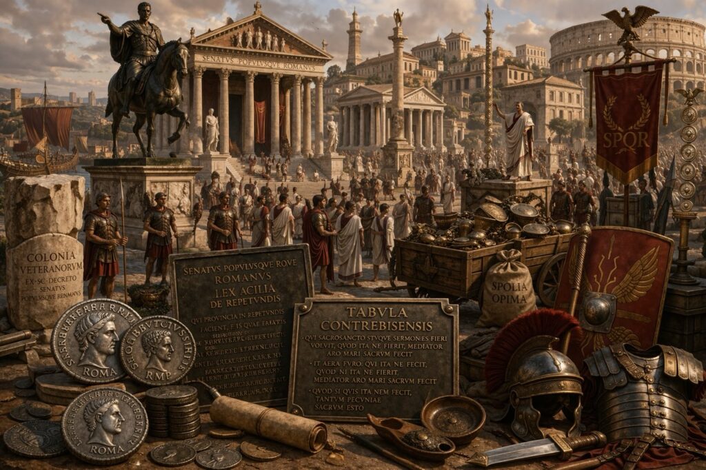 En esta fase, la expansión ya no es solo conquista territorial. Es también consolidación de un espacio imperial que exige gobernadores, tribunales, fiscalidad y control militar continuado. La Lex Acilia muestra el problema del gobierno provincial; la conquista de la Galia muestra cómo la expansión exterior puede crear desequilibrio interior; y Actium cierra la lucha por quién gobernará ese espacio ya definitivamente mediterráneo.