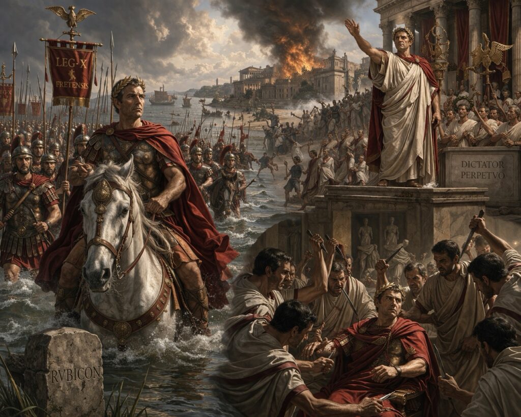La crisis constitucional salta a guerra abierta. César presenta su actuación como defensa de la legalidad y de los tribunos, pero el hecho decisivo es otro: la guerra civil pasa a ser un método de decisión política. Desde aquí, el sistema ya no arbitra; combate.